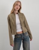 The Mandy jacket in a walnut faux suede, features a slight grown-on collar, seam detailing across the front for a structured look and a center front zipper. It’s a fitted jacket, lined with cotton fabric for added comfort. Styled with our Roomy jeans.